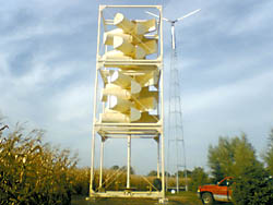 Adam Fuller believes there's great potential in vertical windmills as an inexpensive, efficient energy source. His 12-ft. dia., 36-ft. tall prototype has been quietly spinning since October, surviving strong winds and turning briskly in light breezes while a nearby 120-ft. tall conventional wind turbine remains still.