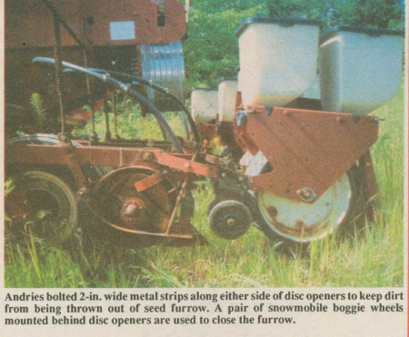 "Using a little scrap iron and parts off a plow and snowmobile, I was able to modify my 4-row 36-in. IH 400 Cyclo air planter so it works as well as any expensive no-till planter or drill on the market.
