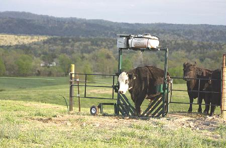 The self-contained sprayer comes mounted on a 2-wheeled dolly that tows behind any vehicle equipped with a 2-in. ball. The totally electronic unit is designed to be placed in the gateway, between the pasture and a pond or mineral source, or anything else that will draw the animals through the sprayer. It comes equipped with a battery, solar charger, 15-gal. tank and expandable wings to close off the gate opening. V-shaped centering bars direct cattle through the center of the sprayer, one at a time.
