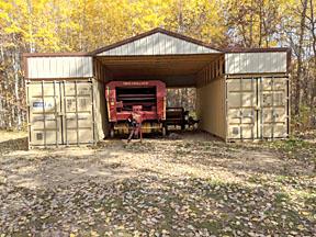Koch planned to run trusses between the two containers but he needed more clearance to store his New Holland baler, Oliver tractors, and other equipment underneath.