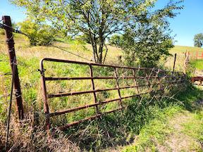 The cable is wrapped around the top bar of steel gates. Wire ties at either end attach it to posts, but when high water comes, they snap, and the gate floats up with the rising water. When the water goes down, the gates do too, retaining cattle until the gates can again be tied up.