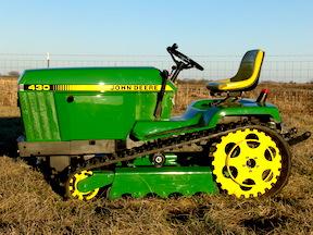 After Irvin Zimmerman and his sons finish working on old Deere garden tractors, they no longer mow. But they look pretty awesome with rubber tracks and are ready to do plenty of other work, such as plowing and tilling.