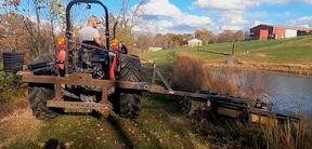 The mower gang sat unused for a few years until Hurst had the idea to use it on the sides of his pond. He’d been using a string trimmer, but that was time-consuming. He first pulled the mowers with an ATV before deciding to adapt them for his tractor.