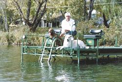 The 44-ft. long, 5-ft. wide dock is painted Deere green. There are two seats salvaged from1950 Model A and Model B tractors located at one end of the dock on a 10-ft. long platform, which has a metal ladder leading down into the water.