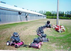Wiebe drives an 18 hp., 42-in. riding mower, and pulls nine 20 and 21-in. hp push mowers behind. Each small mower overlaps the next by a few inches. The handles are removed and the mowers are hitched to brackets on front and back.
