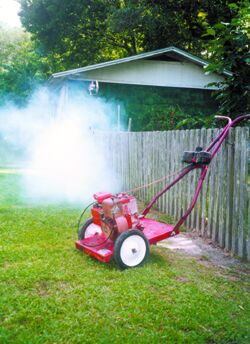After returning home to Florida, Shelton worked out the details. The fogger uses heat from a small gasoline engine to vaporize oil-based insecticides. Engine exhaust then blows the fogged insecticide out the side.
