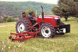 "Moving the mower to one side of the tractor makes it fun and easy to operate," says Van Dam, "and I can see everything well without having to look back. My Massey Ferguson 2625 tractor has power steering so I can turn the mower around on a dime. Also, with the mower on the side I can use it to cut grass over gullies where a 3-pt. mounted model couldn't go."