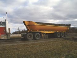 The tires are 8 1/2 ft. apart so the tank fits down in the frame, which adds to the trailer's stability when it's dumped. A large hydraulic cylinder raises the bed up to a 48-degree angle and the tank's curved shape helps everything slide out easily.