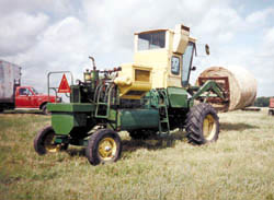 "We use it for everything from hauling round bales to doing blading work and hauling creep feeders between pastures," says Gene Snellings, Montreal, Mo., who converted a pair of old Deere 55 combines into a loader tractor.