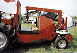Behind the operator platform is a post-hauling platform with a lift crane that loads and unloads posts. The platform also tilts hydraulically to the side to make unloading easier.