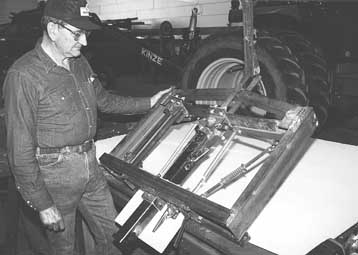 The cost of a commercial pickup shock hitch prompted Marshall Litchfield, Macomb, Ill., to design and build one himself for his Chevy 3/4-ton pickup. "I used mostly scrap metal which kept my total cost much less than commercial shock hitches sell," says Litchfield. He used 2- and 3-in. sq. tubing and 3-in. channel iron to build the main frame. A leaf spring off a pickup mounts on edge at the back of the frame. The back end of a commercial 2-in. receiver hitch bolts to the center of the leaf spring. It cushions the forward and backward movement of the hitch. To adjust the amount of cushion the spring provides, Litchfield designed a bracket connected to two steel rods that he can move to change the mechanical advantage of the spring. A pair of latches can be released, allowing the receiver hitch to slide out and back and forth for hooking up. "I built it last winter after I bought a pickup that was equipped with a utility body but not with a hitch," says Litchfield. "I used it last year to pull my anhydrous wagons and seed-hauling trailers, as well as a 20-ft. tandem axle utility trailer. It'll support a lot of weight. My pickup isn't very high so I cut a hole in the bumper and mounted the cushion hitch inside it, instead of mounting it below the bumper. "Most commercial pickup shock hitches use a coil spring. The leaf spring makes the hitch more compact. The way I adjust the amount of cushion -- by changing the mechanical advantage of a spring -- is unique. On commercial models you adjust the amount of cushion by tightening or loosening the coil spring, which isn't an easy job." Litchfield also rigged up a large rear view mirror that makes it easier to hook up implements to the hitch. The mirror is bolted to a pair of strap irons that are clamped to the pickup's tailgate.