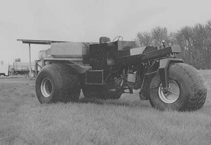 Dale Brock and his son Troy, of Harrisburg, Ore., grow about 1,500 acres of grass seed on low, soft ground. They needed a high flotation machine that would apply fertilizer and herbicides without compacting the soil, but they couldn't justify the cost of a commercial sprayer. They solved the problem by building their own 3-wheeled "swamp buggy" for about half the cost of a new rig. It rides on 66-in. high, 44-in. wide flotation wheels and can be used either as a fertilizer spinner spreader (equipped with a 4,200-lb. capacity steel hopper) or as a sprayer (equipped with a 500-gal. plastic tank and 60-ft. boom). A hydraulic pump driven off the engine crankshaft raises and lowers the boom and also operates the sprayer pump. Dale says the 2-WD rig doesn't have all the bells and whistles found on similar commercial rigs. "But it works great and we saved a lot of money." They used a single length of 2 by 8-in. steel tubing to build the frame, which tilts upward toward the front at an 8 degree angle. Power is supplied by a 351 cu. in. V-8 gas engine out of a Ford pickup. The engine is coupled to a C-6 automatic transmission from the same pickup. The driver sits on an air ride seat and is protected by a steel "half cab" that extends up to the steering wheel. The front wheel pivots on an axle hub off a semi truck that's bolted to the bottom of the front end of the frame. The hub is turned by a hydraulic cylinder to steer the rig. On back is an Italian-made Hurth axle and rear end with internal wet disc brakes, an 18 to 1 gear ratio, and planetary gears mounted on the outside hubs. The machine is equipped with a Raven 660 monitor that's GPS ready. "We started building it in February 1997 and used it that spring on 300 acres," says Dale. "Since then we've used it to apply fertilizer twice every spring and to spray once or twice. We've also done some custom fertilizer spreading with it. We kept the weight down by installing a lighter weight axle and by using a plastic tank instead of a steel one. Six bolts hold the sprayer frame to the swamp buggy and two bolts secure each tank. It takes only about an hour to switch from spraying to spreading. "The rear end's low 18 to 1 gear ratio compensates for the rig's big tires so we can drive slow. We spray at 12 mph and spread fertilizer at 15 and 20 mph. The fertilizer spinner has a 60-ft. spreading width. However, we usually overlap and spread 30 ft. wide at a time." Brock says they're not quite finished with the machine yet. "We plan to finish the cab and convert the machine to 3-WD. We'll drive the front wheel off a transfer case that's already on the machine. Most commercial 3-WD swamp buggies direct-drive the front wheel off the engine crankshaft, which makes it harder to get the front wheel to turn at the same speed as the rear wheels."