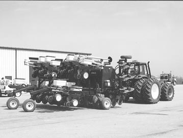 When Kincardine Agri-Farms of Kincardine, Ont., switched to no-till last year, they decided to save money and gain planting flexibility by assembling their own corn and soy-bean planter by using components from various manufacturers. Kincardine puts in more than 8,000 acres of corn and beans each year and need some-thing fast, reliable, and durable. The resulting "Cadillac of no-till planters" cost a lot of money. It can plant 12 rows of 30-in. corn or 23 rows of 15-in. beans. It's equipped with a Till-Tech coulter caddy with Till-Tech coulters on front followed by White planter row units mounted on an Orthman folding stacker bar that allows the planter to be folded to a 6-row width. A pair of Val-Mar dry fertilizer boxes and air blowers mount on top of the rig. The boxes can be used to apply fertilizer alongside the row while planting corn, or to hold seed when planting soybeans. The pull-type rig is supported by two lift assist wheels on back. The planter was built for Kincardine by Till-Tech Systems, a planter manufacturer based in St. Thomas, Ont. "The combination of a coulter caddy and toolbar planter provides a lot more flexibility in how you can use the fertilizer and planting equipment," says Ron Prong of Till-Tech. "This system works great for planting in narrow rows because the row spacing is easy to change. With a conventional planter you normally have to decide when buying whether you a want 30 or 20-in. row planter because row spacing is difficult to change." Till-Tech stripped an 8-row White planter down to the frame and mounted the row units on a modified Orthman stacker bar, which folds from 30 to 16 ft. in both the 12-row, 30-in. row corn setup and the 23-row, 15-in. row soybean setup. The unit has a transport width of 21 ft. The stacker bar is attached to a 3-pt. hitch on back of the caddy. A pair of Valmar dry fertilizer boxes mount on top of the stacker bar and are filled by a cross auger mounted above them. A pair of blowers are used to deliver fertilizer to the tillage coulters and seed to the row units. "The Valmar boxes each hold about 3,000 lbs. of fertilizer which is placed two to three inches to each side of the seed," says Prong. "The boxes can also hold three tons of soy-bean seed, allowing Kincardine to plant 70 to 80 acres before they have to refill. The coulter caddy uses three wavy coulters to loosen the ground in front of each corn row and two in front of each soybean row. Last fall Kincardine used the coulter caddy and fertilizer boxes to band fertilizer. They'll plant corn between the bands this spring. And this fall they plan to use the caddy and boxes to seed winter wheat in 7-in. rows. They'll mount 52 planting units on another toolbar that will be pulled behind the caddy. "Another advantage is that the planter is equipped with Accu-Plant hydraulic controls which make it compatible with Global Positioning Satellite technology. It allows variable application rates for both seed and fertilizer. "The planter requires five remote hydraulic outlets -- one to raise or lower the coulter caddy, one to fold the planter toolbar, one to raise the planter itself, one to operate the blower that delivers fertilizer, and one to operate the blower that delivers seed. We use flow control valves to raise or lower the planter wings and to operate the cross auger. "We used the same idea to help another farmer who had a double frame New Idea planter and wanted 20-in. rows. We installed a coulter caddy on front and added fertilizer boxes, blower systems, and extra row units between the existing ones. However, the extra weight overloaded the planter frame and tongue so he had to add lift wheels on back." Because of the extra weight of its new planter, Kincardine had to trade for a Deere 8400 235-hp MFWD tractor.
