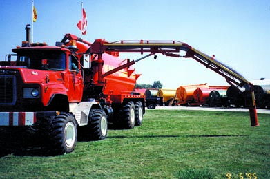 Old Army trucks make great liquid manure haulers, says Nuhn Industries, Ltd., Sebringville, Ont., which is doing a booming business removing the beds from used 6-WD military trucks and using them to pull big fifth wheel liquid manure tanks. The tanks have up to 7,500 gal. of capacity. The company recently sent FARM SHOW photos of a 6-WD Army truck, equipped with a Cummins 300 hp diesel engine and Mack 5-speed transmission, pulling a 24-ft. long, 6,750-gal. tank. The machine is being used by Sammerich Farms, a local custom spreading business. Owner Joost van der Heiden found the army surplus truck, then turned it over to Nuhn to add a fifth wheel hitch and trailer. The rig rides on five axles and is equipped with a 40-ft. long, 8-in. dia. self-loading boom on the driver's side. The boom is controlled by hydraulic cylinders and swings back and forth against the side of the truck like a combine unloading auger. It allows the operator to use push button controls in the cab to fill the tank from a pit in only 3 or 4 minutes. The rig's boom, vacuum pump, and manure-unloading mechanisms are all hydraulically driven off the truck engine. The rig is equipped with "shallow lug" flotation tires made by an Israeli company -- Alliance Tire Co. -- that exert just 8 to 10 lbs. of ground pressure. The shallow lugs create a gentle driving action that allows farmers to spread manure onto hay crops without killing off tender alfalfa plants. "Tractors are too slow for hauling manure and conventional truck-mounted liquid manure haulers don't have enough capacity. Our Army truck hauler gives you the best of both worlds," says Dennis Nuhn. "The trucks generally have low miles and are way overbuilt so they're very rugged. They're equipped with spring suspension, and we build leaf spring suspension into our trailers so they pull much smoother than a tractor-pulled unit. "The tank's weight is distributed equally on 8 wheels which results in excellent flotation. The driver can go 40 mph on the high-way, then pull into a field and climb a 40 percent grade while carrying a full load of manure and spread it with minimal compaction. One advantage of the fifth wheel trailer design is that the tank is mounted 2 to 3 ft. lower than a conventional truck-mounted tank which means less vacuum pressure is required to load manure into the tank. That results in quicker loading and lower power requirements. The vacuum pump we use is equipped with a unique turbo filter that automatically keeps out dust as the tank is being unloaded. "The tires on our manure hauler have a bigger footprint than conventional flotation tires and cause less compaction than standard lug-type tires. They also wear better on the highway. Conventional tires squeeze hardest on the outside edges of the tires which compacts the soil. These new tires leave a consistent footprint across the width of the tire which reduces compaction. Also, they don't grab as hard and 'peel' grass off. "The driver generally engages only the truck's rear two axles but can engage the front axle if necessary. It's nice to know the extra pull is there if you get bogged down. "The truck was originally equipped with a cloth covered cab. We wanted more visibilty and room so we cut it off and built a new cab with more glass. If we could do it over we'd make the cab taller and with bigger windows for even better visibility."