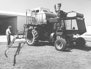 If you've ever considered building a self-propelled crop sprayer out of an old combine, you might want to listen to Richard Cox who turned a 1975 M Gleaner with hydrostatic drive into a fast, smooth-riding spray rig. The Franklin, Ill., farmer says Gleaners are the best machines to use. "What I like about Gleaners for this purpose is their big, heavy-built channel iron frames," Cox says. "The tin work isn't used to hold them together like some other combines, so you can remove just about everything and they remain structurally sound." He started by removing the header and all grain-cleaning components from the machine, which he bought specifically to build the sprayer. He shortened the rear end of the combine by 2 ft. so it would better fit into his machine shed. The sprayer is equipped with a commercial 54-ft. boom with 21-ft. wings and 12-ft. middle section. Nozzles are on 20-in. spacings for broadcasting pre-emerge and post herbicides on 700 acres of drilled beans and 700 acres of corn on 36-in. rows. The front-mounted boom mounts on a shock-absorbing bracket Cox built out of steel tubing and strap iron. It's equipped with a used combine header spring on each side to reduce bounce, as are larger 18.4 by 34-in. tires that he installed. "There's hardly any bounce to the boom. And front-mounting allows the operator to clearly see every nozzle," Cox notes. "The taller, narrower front tires smooth out the ride and allow you to operate in drilled beans without running as many down. Plus, they gear it up faster for field speeds of up to 11 mph." Cox removed the combine's grain tank and replaced it with an 800-gal. tank he found at a farm sale. The 8 ft. long by 4 ft. dia. stainless steel tank is ideal for the M Gleaner, he says. A big, shop-type air compressor is installed on the left side of the machine to power the marker system and to clean nozzles. It runs off the clutch that originally powered the header and is connected to a 30-gal. tank mounted inside the rear of the combine. "Running at field speeds of up to 11 mph, we can spray 300 acres in a short day, no problem," Cox says.