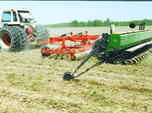 "If I can't buy the tillage equipment I need I either build my own or rebuild existing equipment. The result is tremendous cost savings," says Leslie Johnston who, along with sons Danny and Doyle, put together three home-built tillage rigs. The tillage rigs include a 28-ft. wide disk harrow with a 29-ft., hydraulic-fold roller on back; a 27-ft. field cultivator pulling a 500-gal. stainless steel nurse tank; and a 20-ft. drill equipped with a spring tooth cultivator and roller on front. "We plant 500 to 600 acres of soybeans each year and have used these rigs for 5 years. They each do several jobs in one pass which saves a lot of time and fuel," says Johnston. Disk-Roller: He built the roller out of a used 15-ft. Deere Culti-Mulcher. "The roller's tongue is so heavy I had to make a dolly to support its weight. The dolly hitch attaches to the disk's front gang and is equipped with crazy wheels that came off a Hi-Boy 4-wheeled sprayer. I used channel iron to build the dolly. Hydraulic hoses run directly from the disk to the cylinders on the roller so that when I turn the disk and roller both raise at the same time. The roller wings fold straight up for transport. The roller breaks up clods without compacting the soil and makes a beautiful seedbed. We some-times pull it behind the field cultivator. "We use a 340 hp articulated tractor to pull this combination." Field Cultivator & Spray Tank: Johnston used 3-in. sq. steel tubing to build the 27-ft. field cultivator which is used to incorporate chemicals. A pto-operated pump applies chemicals through a boom mounted on front of the cultivator. A Remlinger 3-bar harrow mounts on back. "The cultivator has six rows of teeth for excellent trash clearance. Most conventional field cultivators have only four rows of teeth. The 27-in. long vibrating shanks really shake the dirt and mix the soil well. We set the shanks to run about 2 in. deep and go 7 to 8 mph. "The tank carrier frame is built from 6 in. sq. steel and is strong enough to support a 1,000-gal. tank. It mounts on a pair of dual crazy wheels on back and single solid wheels in front. I used 2 1/2-in. dia. steel pipe to build the tank carrier's 20-ft. tongue. The tongue is long enough that when I turn, the field cultivator and harrow swing under it without interference. By building the tank carrier myself I saved about 90 percent of the cost of a new commercial rig. I use a Case-IH 1586 2-WD, 225 hp tractor or an Allis-Chalmers 7080 to pull this combination." Drill Cultivator Combo: The 20-ft. spring tooth cultivator, roller, and 3-pt. Great Plains drill all mount on a carrier that hooks up to the tractor drawbar. The carrier is sup-ported by a pair of 4-ft. high wheels and an 8-ton axle and spindles off a big fertilizer sprayer. The cultivator is equipped with 15-in. long S-tines that level the soil, wiping out wheel tracks. There are two gauge wheels on front of the cultivator, and the roller itself serves as a gauge wheel for the back of the cultivator. Johnston made the roller by converting a Deere Culti-mulcher originally equipped with two 10-ft. wide sections, one in front of the other. He removed both rollers and mounted them side by side, then used sq. steel tubing and 6 bearings to make an axle. "We use a Case 1370 2-WD tractor equipped with duals wheels to pull this combination," says Johnston.