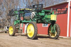 When Neil and Steve Soehren built their own high-clearance sprayer, they gave it something no commercial rig has both articulated steering and front-wheel steering. The articulation lets the rear wheels exactly track the front wheels on end rows. However, when desired, the articulation joint locks and front-wheel steering takes over. "Making slight adjustments on straight rows and at road speed is easier with front-wheel steering," notes Neil. Flipping between the two steering modes is as simple as stepping on a clutch-type pedal on the cab floor. The pedal controls a valve that moves hydraulic fluid from the cylinders controlling the front tie rod to the cylinders on the articulation joint. To lock the front end when needed, the Soehrens designed a tie rod using a square tube inside a square tube. When the front wheels are aligned straight ahead, a pin slips in to lock the two tubes in place when the control pedal is pushed. The same action unlocks the articulation joint as hydraulic fluid is directed to its cylinders. Positioning the articulation joint was a challenge. To experiment, the brothers built a model tractor, rolling it around the floor and studying it. Eventually they determined that the halfway point between the rear end and the front of the boom would give the best tracking. Neil describes his brother Steve as the idea man and himself as the builder. The process began by stripping down the old IH combine and evaluating parts. After overhauling the motor, they began to modify and assemble components. As Steve conceived how things should work, Neil figured out a way to make them work. "We used almost all the drive and hydraulic components, as well as the cab, transmission and motor," says Neil. "We even used the sheet metal from some of the side access doors to make a cover for the engine on the sprayer." The front frame was fabricated from pieces of the combine frame and 3 by 5-in. rectangular tubing. The rear frame was fabricated from 4 by 6-in. steel tubing from an old plow frame. The articulation joint is about 30 in. high with Timken bearings at either end of the shaft. All the control cables and spray hoses run through a cable bracket attached to the top of the joint case. Bi-modal steering is only one of the nifty features on the Soehren's sprayer. Because they wanted to use the sprayer as a high boy for late season applications, the brothers wanted 6 ft. of clearance. This required fabricating legs for steering wheels and drive wheels. Part of the combine's final drive was used for the drop case chain drive on the rear wheel legs. After lengthening the combine's drive axle to 120 in., they attached sprockets from a Deere 6620 hillside combine to the drive stubs and dropped a #100 roller chain to it from a sprocket on the IH axle with all of it inside an oil bath. The Soehrens put jack screws on the upper sprocket so they can tighten the chain without opening the oil- filled chamber. "It also avoided using a tightener that would loosen up whenever we backed up," says Neil. To make the front legs, the combine steering axle was cut apart and the new design fabricated on the floor. The front axle was then lifted and fastened to the frame at a center pivot point. This allows the front end to flex with the contour while the rear axle is fixed to the frame. The front wheel spindles and hubs were from an old heavy-duty fertilizer spreader. The shaft that connects the wheel to the tie rods/cylinder arm was about 4 ft. long and inside a leg-pipe fixed to the frame. Neil realized that once in place, it would be very difficult to work on bearings as the wheels would have to be at least 4 ft. off the ground in order for a wheel, bearing and shaft to be released. "I cut the shaft off and turned male and female tapers that would fit together and cut a keyway in them. I ran a bolt up through the center from the bottom to lock them together," he says. "This lets me take the bolt out and drop the wheel and bottom foot of the shaft off if I need to work on the bearing or something." Rear wheels were custom-made for 12.4 by 54 tires. The 12.4 by 42's were mounted on the front. The narrow wheels allow the sprayer to run down 15-in. rows without a problem. The front-mounted boom hangs on a center pivot point on a sub frame that is raised and lowered with hydraulic arms from the main frame. Float is maintained with the aide of nitrogen accumulators that originally adjusted the header height on the combine. The boom design is based on commercial booms and has 5-ft. breakaways at either end. For transit, it folds around the sprayer. Originally designed for a 90-ft. width to match a 12-row planter pattern, it was later cut back to 80 ft. for two passes of a 16-row planter. "Having the cab up above the 6-ft. clearance frame keeps it above the spray pattern too," says Neil. "In high corn you can hardly see where the rows are if the wind is blowing the corn." Two 440-gal. stainless steel tanks from Ag Chem sprayers are mounted to the rear half of the sprayer frame, just ahead of the engine. The sprayer pump runs off a belt drive on the engine. "The pump is on a 12-volt actuator," says Neil. "To start the pump running, we just lower the pump to tighten the belt. To stop the pump, we just raise it enough to let the belt run loose." Neil used electric window switches to run the actuator, with one mounted in the cab and a second switch beneath the frame. "It will go 30 mph down the road and also crawl slowly as needed through the field," says Neil. "Usually we run at about 8-12 mph."
