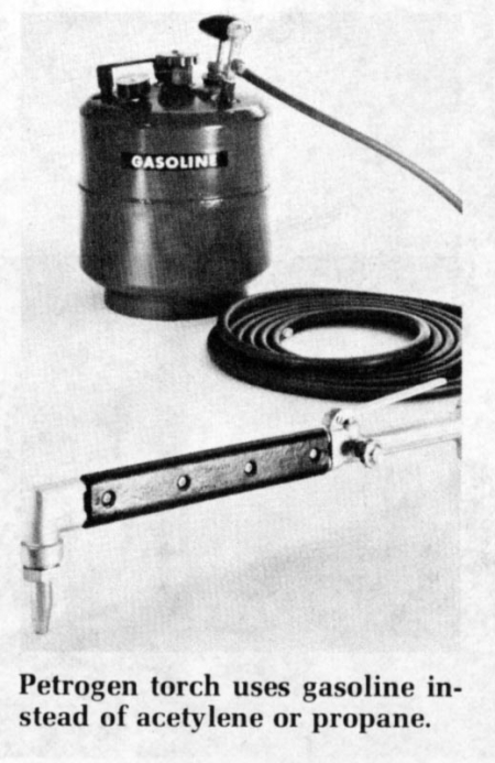 "Being able to burn gasoline can reduce fuel costs 95%," Jack Stites, a national distributor of the new Petrogen torch, told FARM SHOW. "One gallon of gasoline does the work of 100 cu. ft. of acetylene." He cites the following additional advantages for gasoline over acetylene: