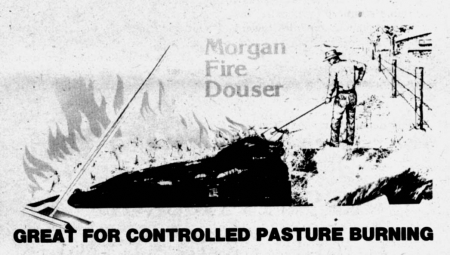 A new fire control aid called the Morgan Fire Douser may be just what you need to put out grass fires and to control pasture burning. It uses no water, is light enough to carry across fences, ravines and ditches and fits easily in a car trunk or truck cab for transport.
