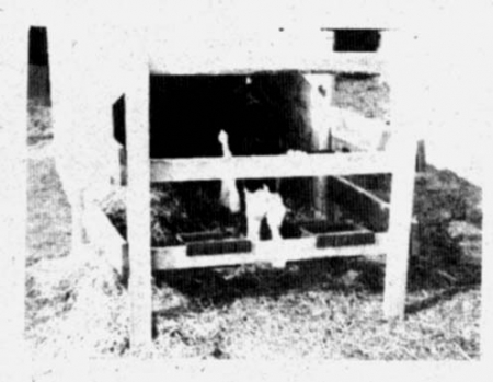 Calves are kept in the hutches 8 to 10 weeks, and the extensions are built so as to keep calves in without netting or fencing. Two feeders are mounted on the lowest rung of the frame.