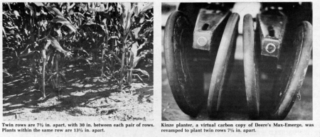 He and Beckman have been working on the idea for the past four years. They began experimenting with a 12 row Max-Emerge planter by first planting in regular 30-in. rows, then doubling back to plant a "twin" row 6 in. from the original row. The difficulty of maintaining straight rows, and getting proper seed placement between rows, led them to try the veteran Burch twin row planter which has been on the market for many years. Poor depth control and seed placement prompted them to try still another approach last year. They took a Kinze planter unit, which is a virtual carbon copy of Deere's Max-Emerge, cut it apart and then re-welded it, making it into a two row "twin row" planter.