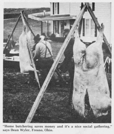 He's a dairy farmer who sells feeder pigs as a sideline, holding back a few choice hogs to fatten for home butchering. "Much of the meat is canned because it's easy to store and handy to use all through the year. Our group used to also butcher an occasional beef or veal, but it's mostly hogs now," he points out.