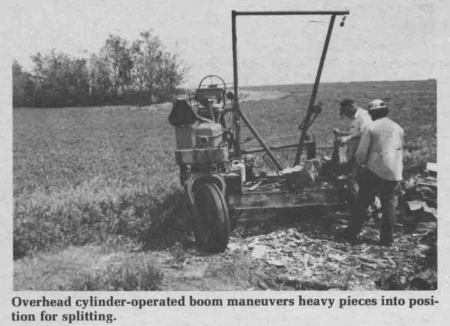 The unique splitter is not only fitted with a hydraulic wedge-type splitter, but also has a buzz-type saw powered off the engine and a hydraulically operated boom for pulling logs out of hard-to-reach spots for cutting. A trailer pulled behind the machine for hauling wood home gives Brown "the ultimate all-purpose wood handling machine."
